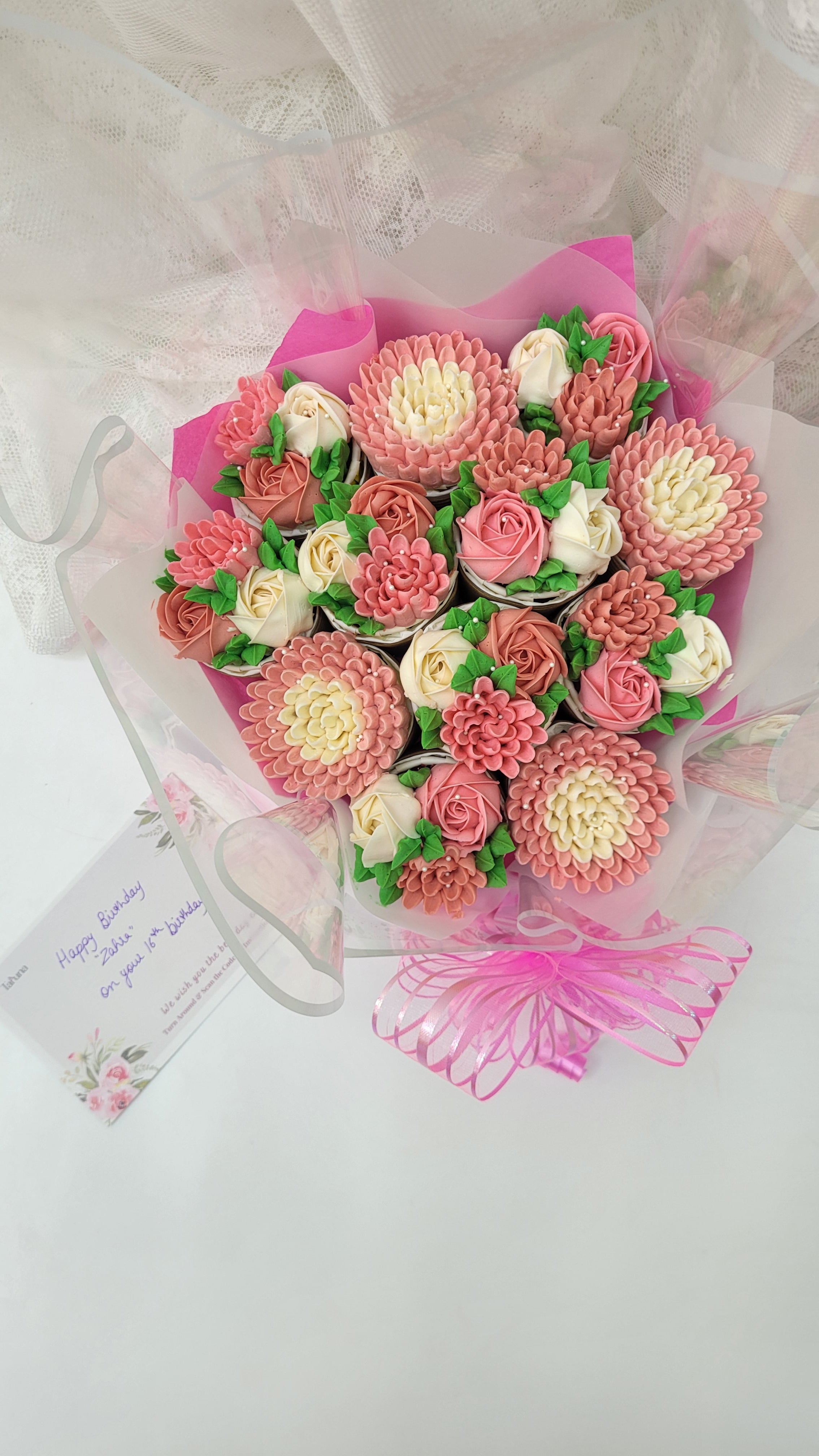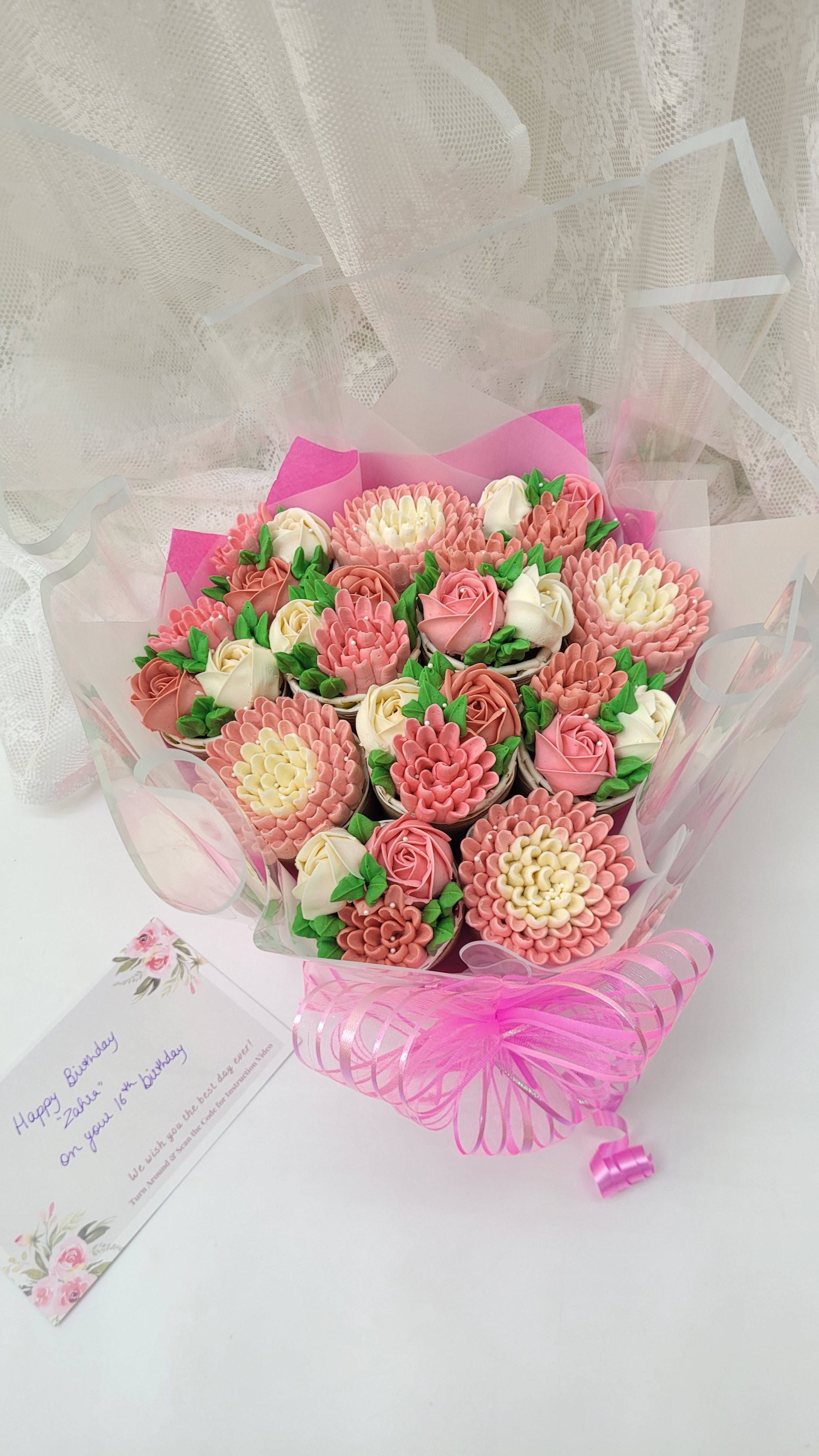 This Egg free Cupcake Bouquet has a variety of real looking flowers arranged in an aesthetically pleasing manner on cupcakes. Green buds and leaves are interspersed among the flowers, adding to the vibrancy and freshness of the bouquet. Flowers are Piped with our Signature Swiss Buttercream on Freshly Baked Pillow soft Cupcakes. The Cupcakes in the bouquet are a mix of Vanilla, Chocolate & Red Velvet Cupcakes. Floral Cupcakes are wrapped with a translucent food safe Parchment & Cellaphone paper making them Festive and Affectionate in appearance. A ribbon is tied around the wrapping paper, complementing the greenery within the bouquet and adding a finishing touch to its presentation.